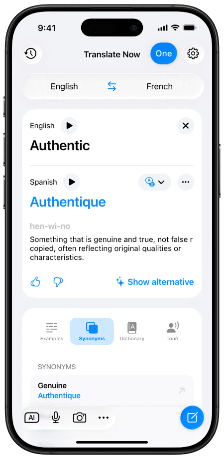 Enjoy smarter AI-powered translations with grammar correction, context awareness, and support for Canadian and European French variants.