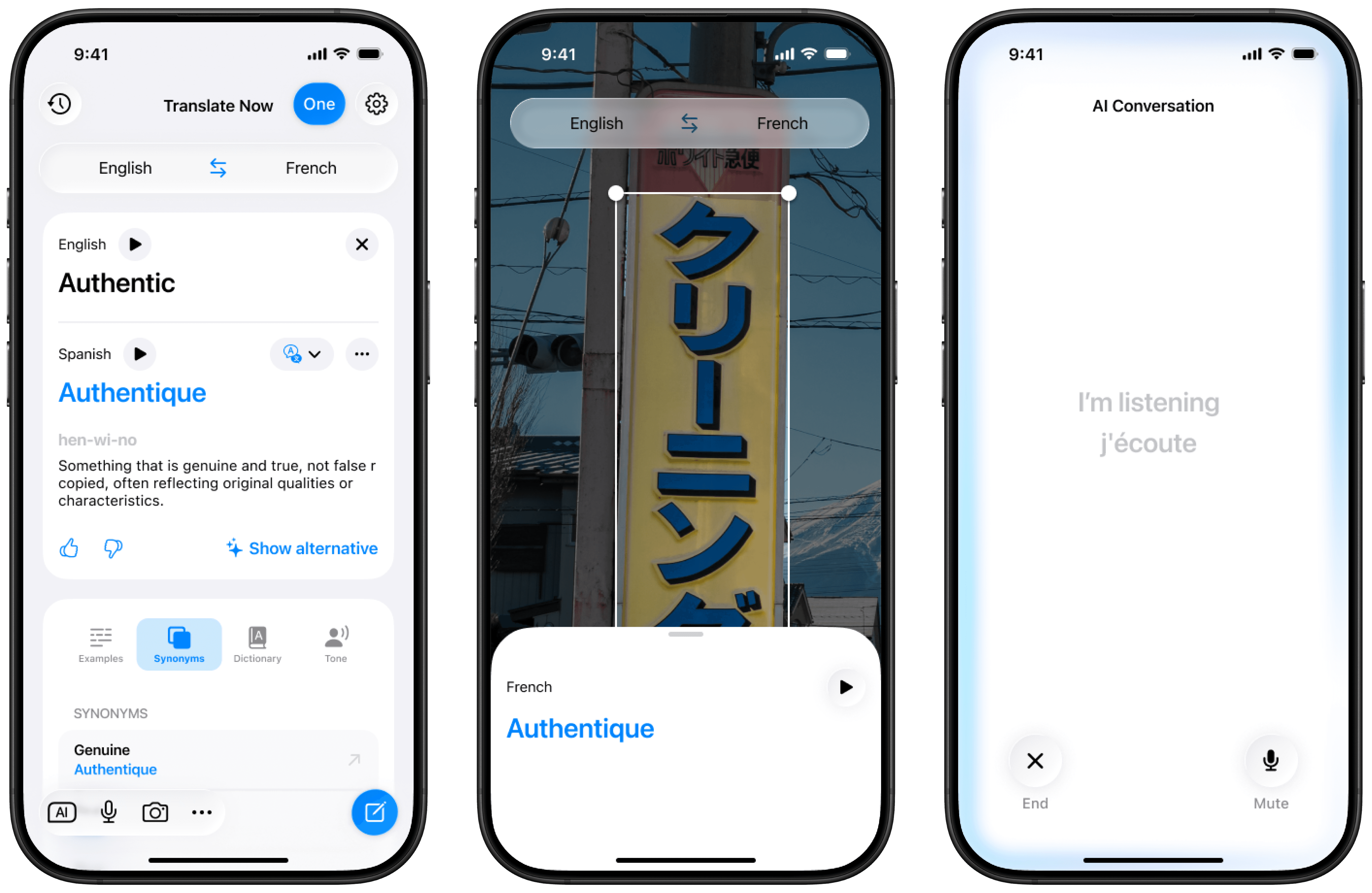 Point your camera at menus, road signs, or documents and see instant English ↔ French translation.