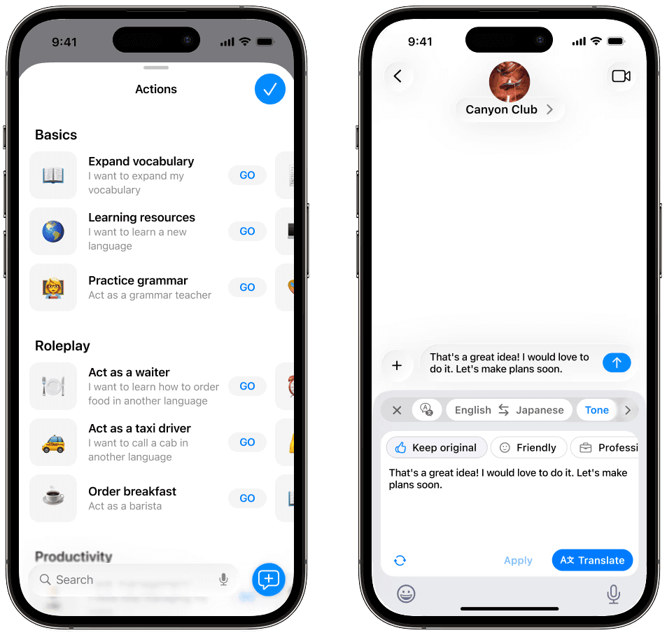 Speak naturally in English or Japanese and Translate Now provides instant voice translation, ideal for conversations, calls, or meetings.