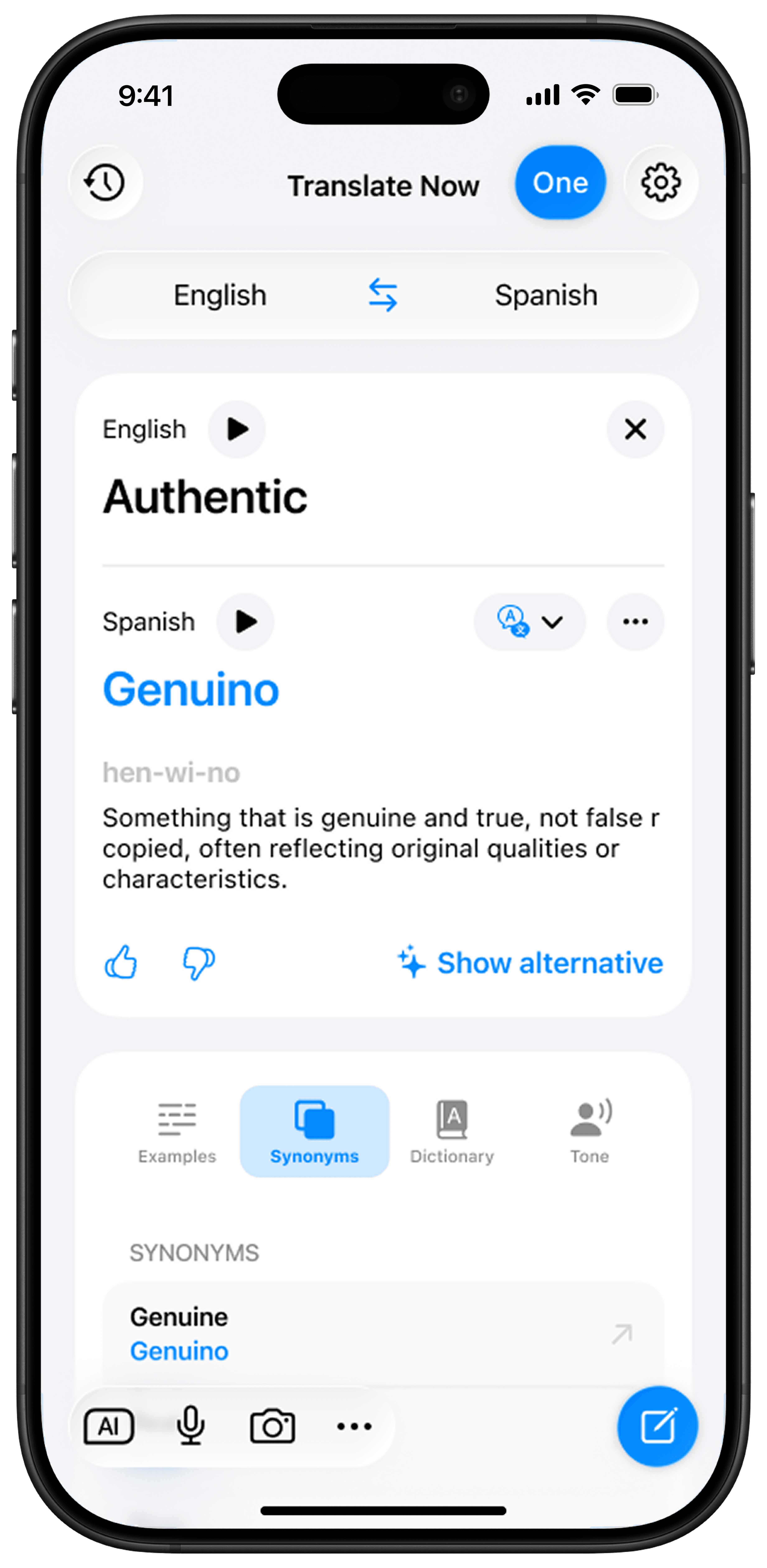 Translate Now is the easiest way to translate Spanish to English or English to Spanish on your device. With powerful AI, offline mode, and the translator keyboard, it is more than just an online translator and works as the best English to Spanish translation app for travel, study, and work.